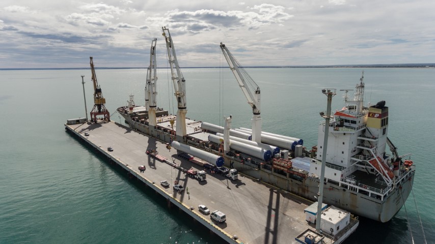 Patagonia Norte lleva a cabo en San Antonio Este la descarga de molinos éolicos para los proyectos Pomona 1 y 2 (Provincia de Río Negro).